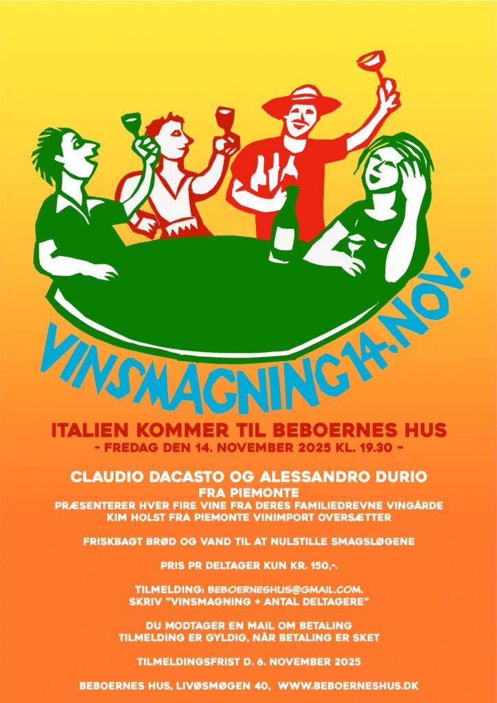 Det koster 150 kr. at deltage, skriv en mail til beboerneshus@gmail.com, skriv “Vinsmagning” + antal af deltagere. Så vil du modtage en mail fra os, med info omkring hvordan du betaler. Tilmeldingen er gyldig når vi har modtaget betaling. Deadline for tilmelding er d. 6. november.